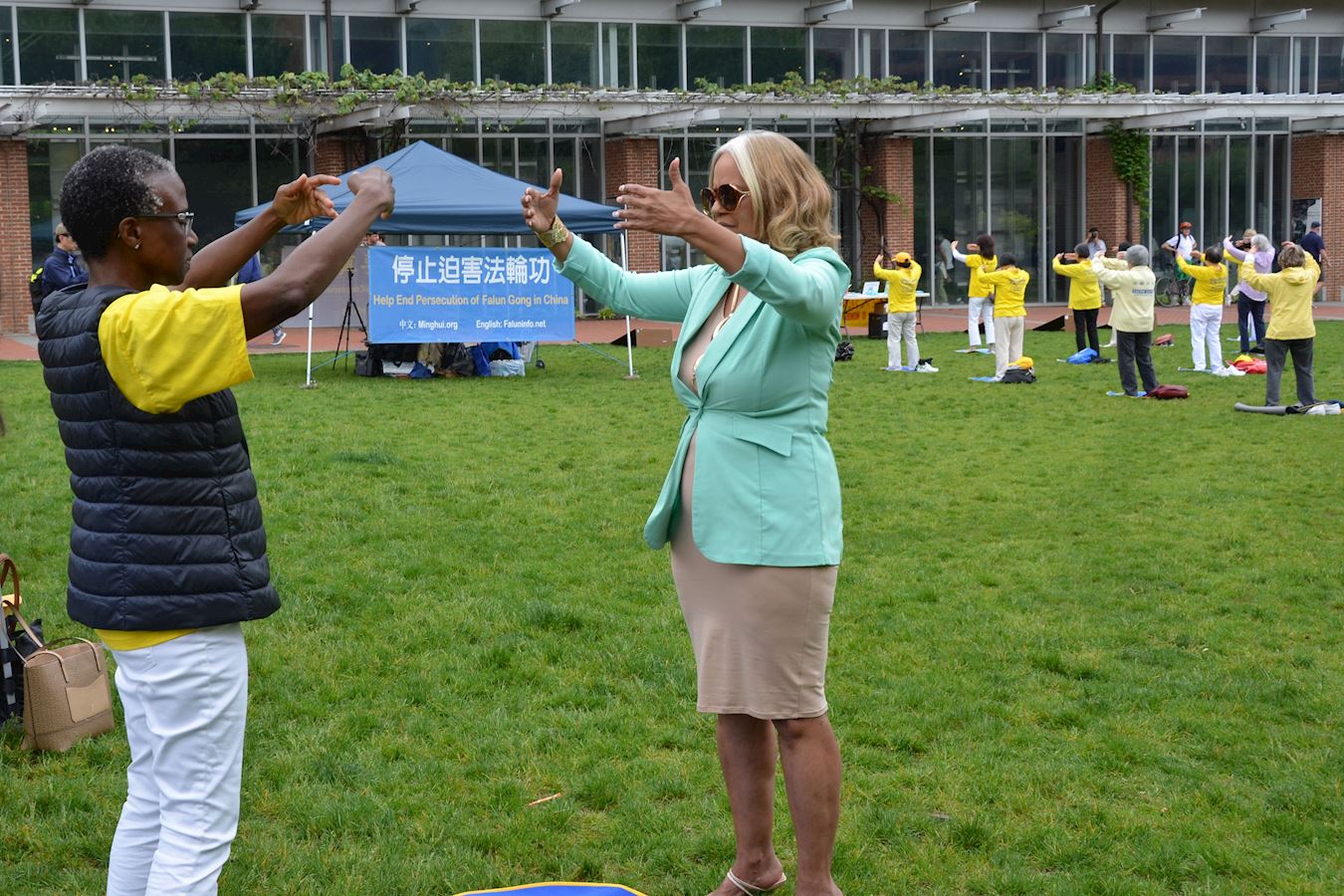 ![]() 图8:卡门·索萨(Carmen v Sousa)女士(右)还在现场学炼了法轮功,并参加了庆祝活动。 |
