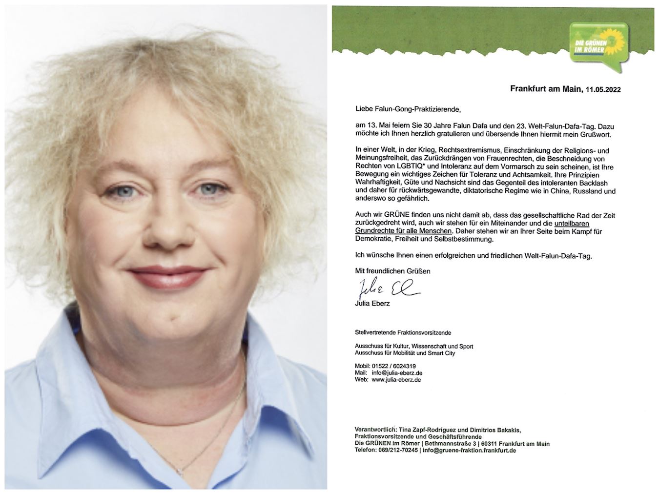 法兰克福市议会议员朱莉娅·埃伯兹(Julia Eberz)祝贺世界法轮大法日