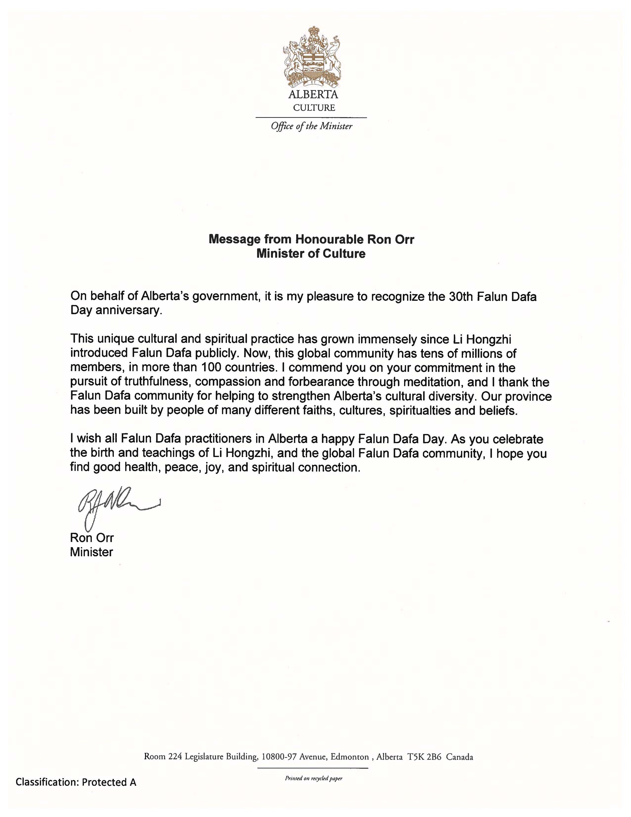 【明慧网二零二二年五月二十日】在法轮大法洪传世界三十周年的里程碑时刻,加拿大亚省(Alberta)三级政要发来贺信和视频,恭祝法轮大法日。