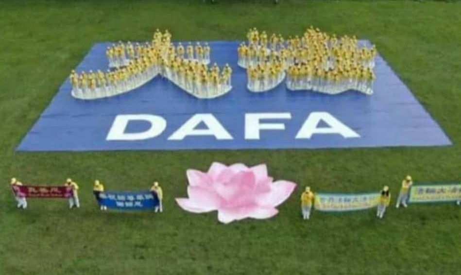 五月十四日的午后,虽然多云但没有下雨,法轮功学员在宽大的草坪上,排出金色的“大法”二字。