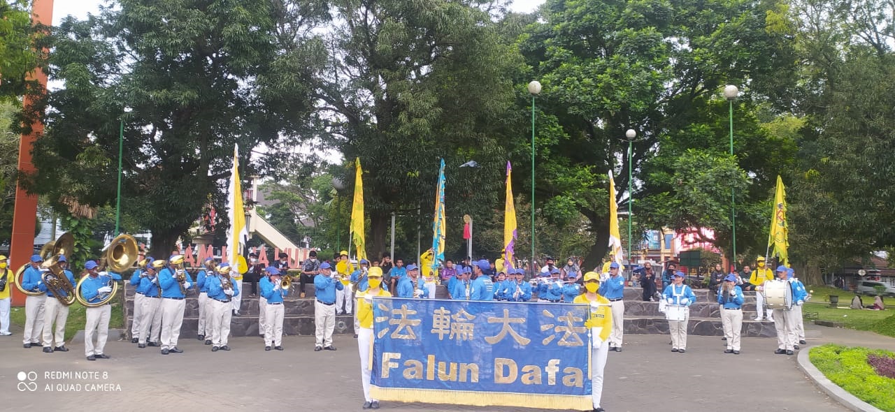 傍晚,活动队伍在玛琅镇广场购物中心(Malang Town Square)继续演奏,天国乐团和腰鼓队演奏大法弟子谱写的乐曲,给观众传递大法的美好与慈悲。仙女队向游客们赠送手制莲花和大法真相资料。