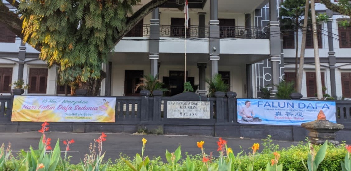 ![]() 图4:两幅以庆祝世界法轮大法日为主题的横幅挂在玛琅市众议院大楼的入口处。 |
