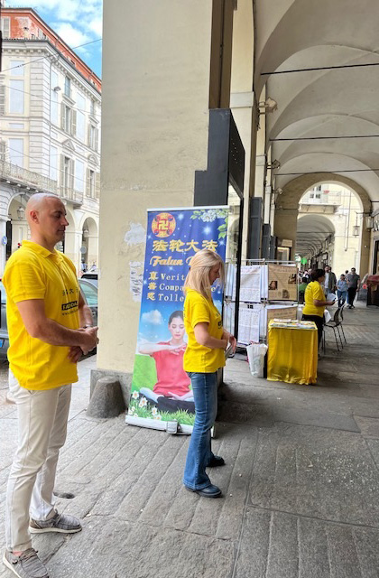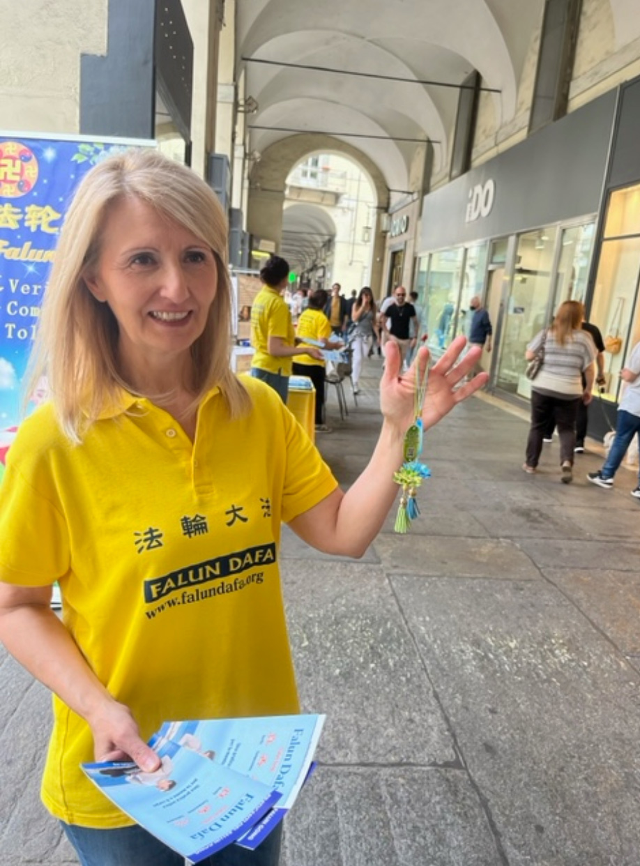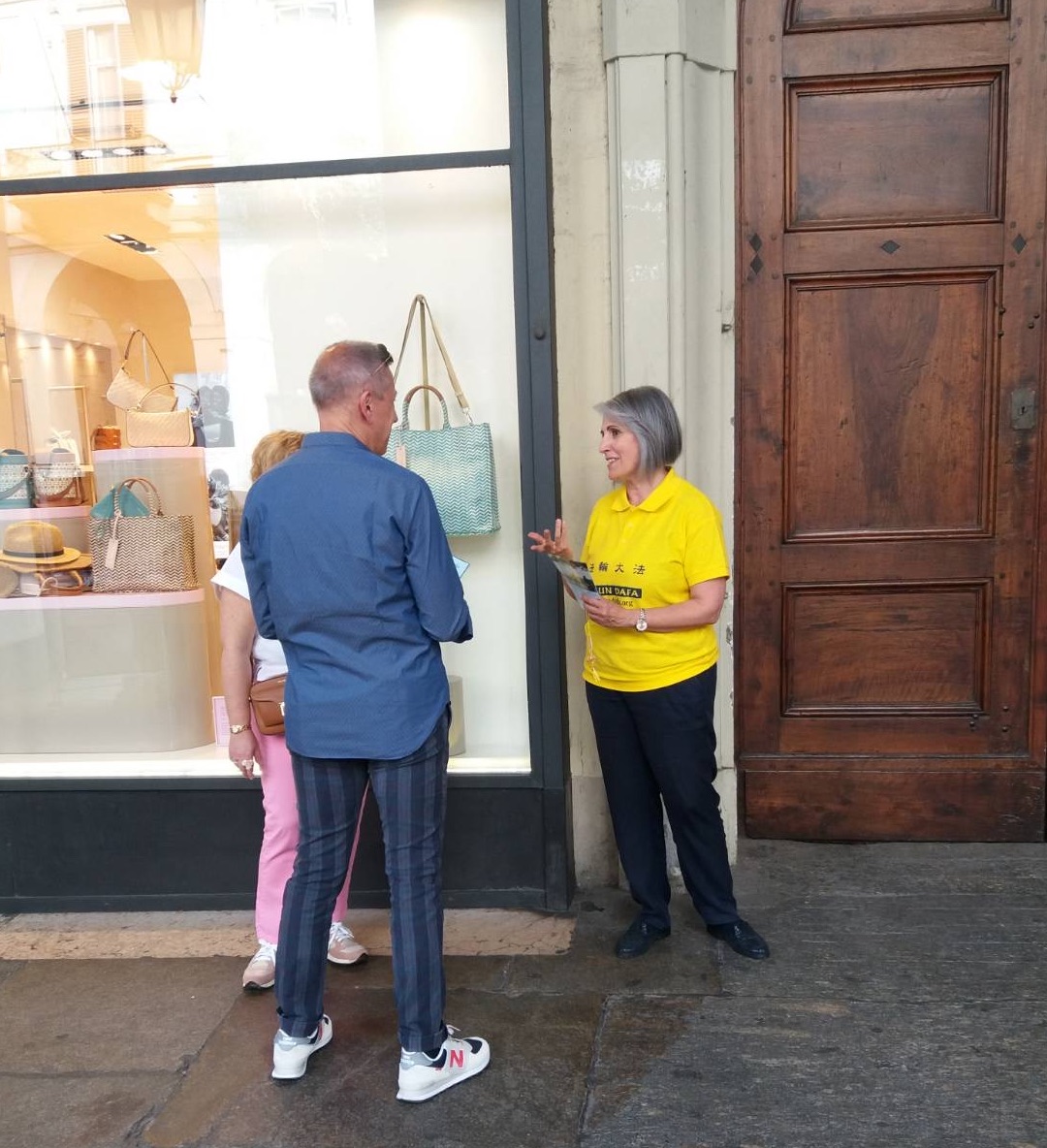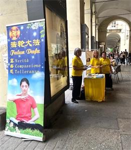 五月十三日当天阳光明媚,春风和煦,活动期间当地意大利民众及各国游客络绎不绝,许多人被悠扬恬静的大法音乐及学员展示的五套功法所吸引,驻足观看。