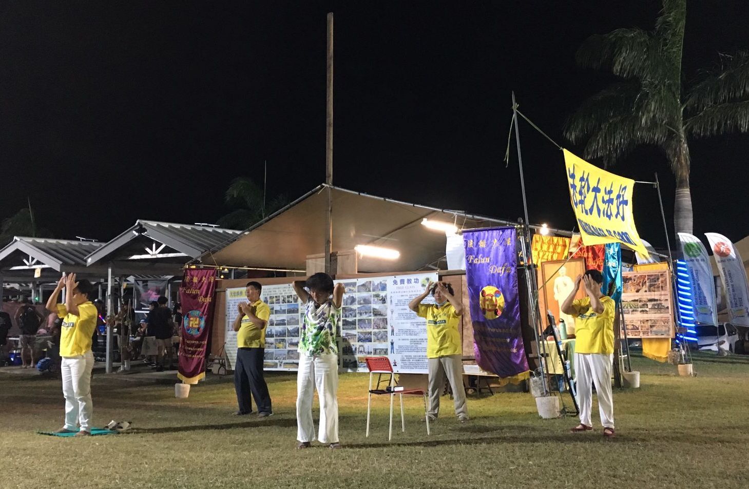 ![]() 图1:法轮功学员在真相展位里打坐,展示功法 |