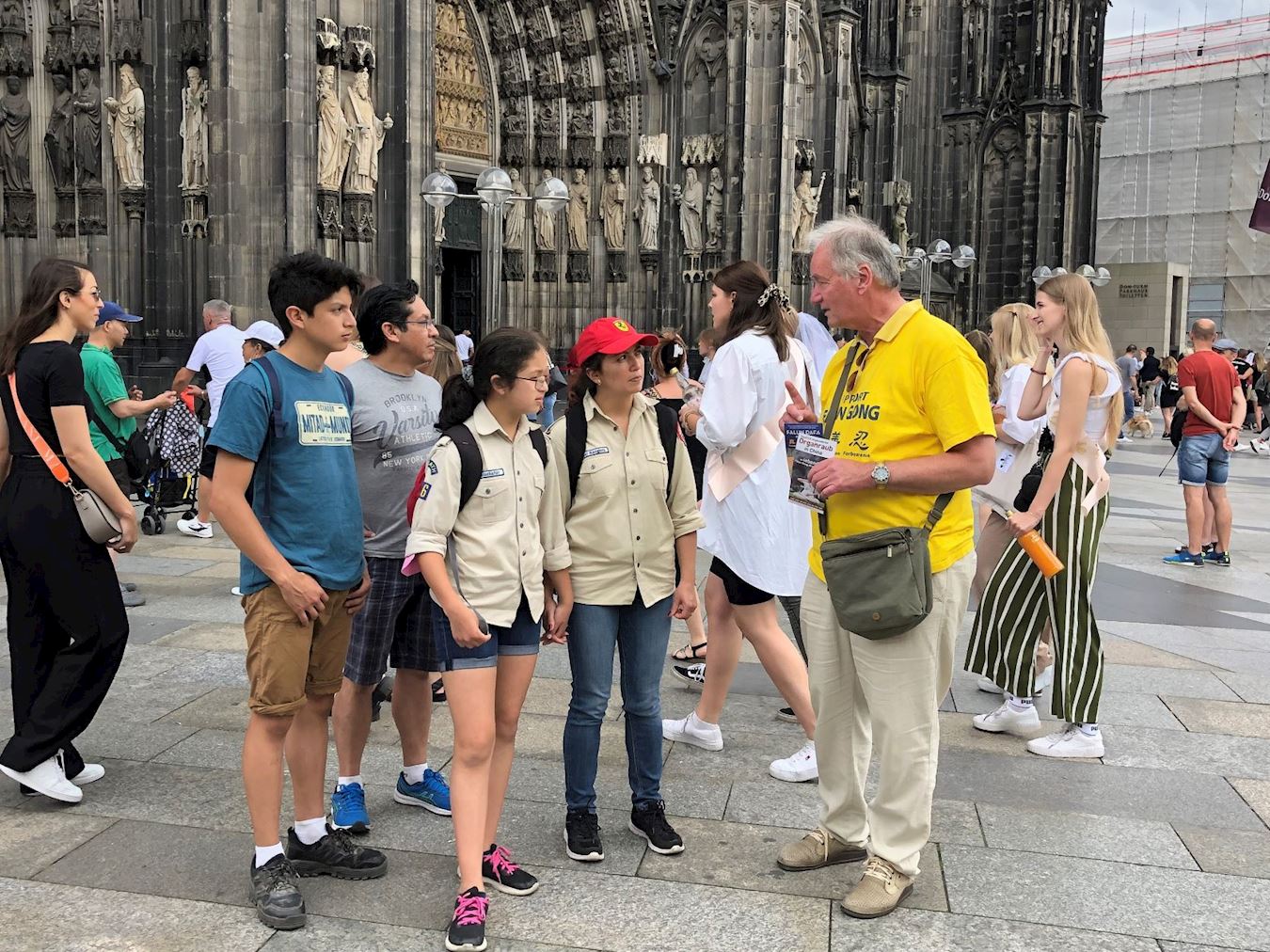 活动这天是周六,天气晴朗,活动当天科隆大教堂前的广场上聚满了来自世界各地的游客。学员们的腰鼓表演赢得了阵阵掌声,很多人被平和的功法演示吸引,主动驻足向学员们了解法轮功。