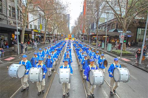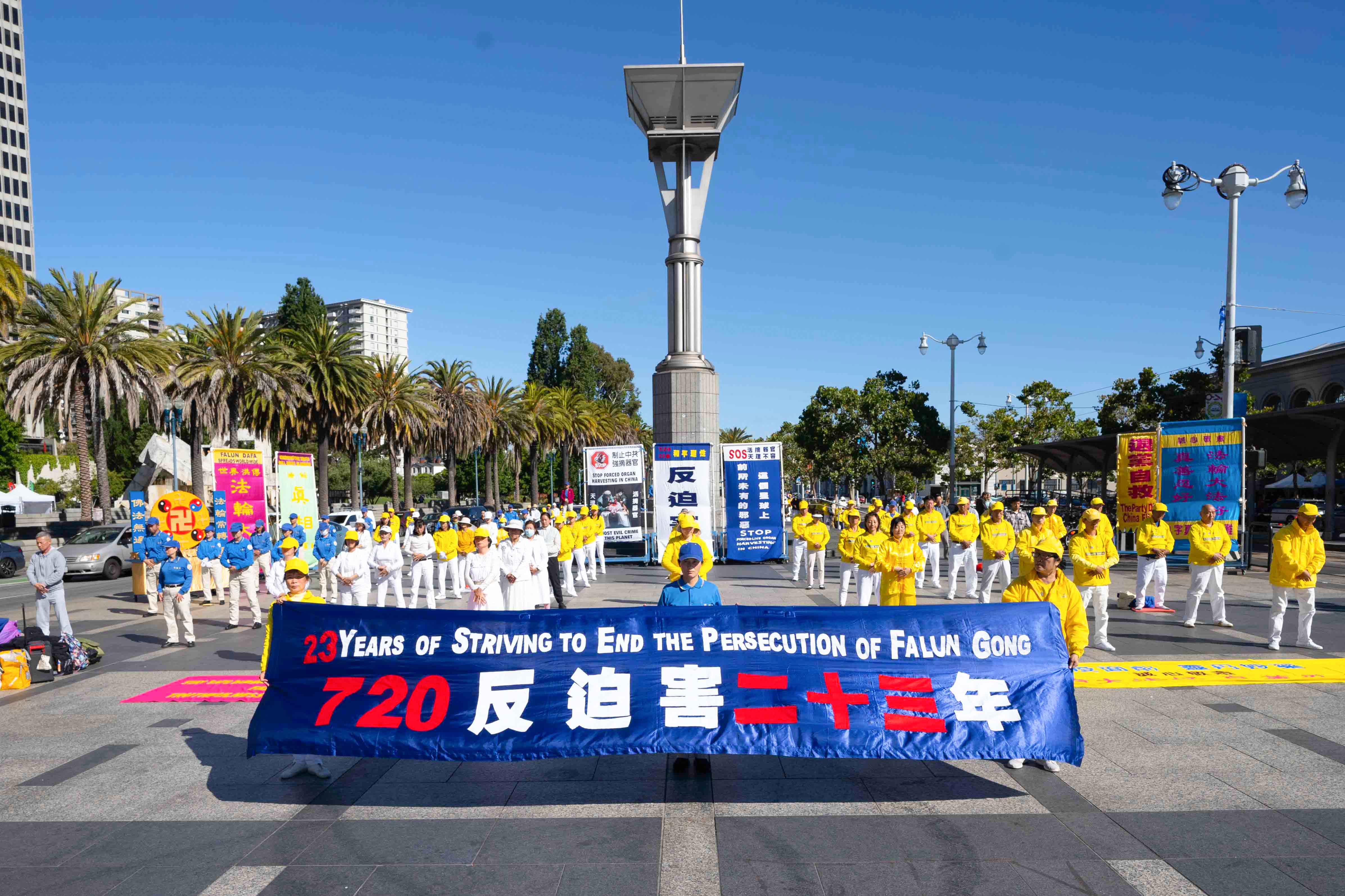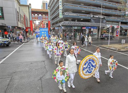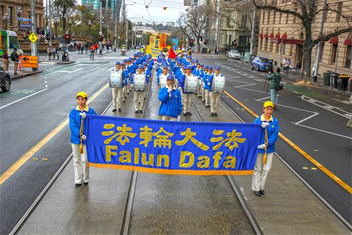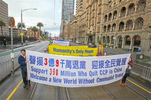 中午十二点,游行开始。法轮功学员从渡轮大厦出发,沿着市场街,进入唐人街,最后抵达唐人街花园角广场。