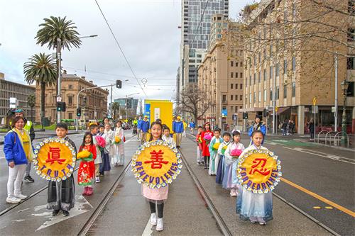 法轮功学员反迫害集会游行,吸引不少人驻足观看和录影拍照。来自广州的年轻父母带着孩子在旁观看,非常激动地表示,“非常震撼,非常震撼!”