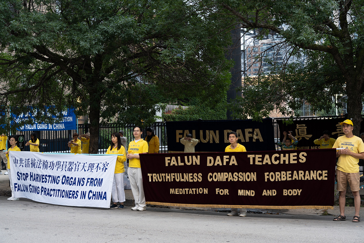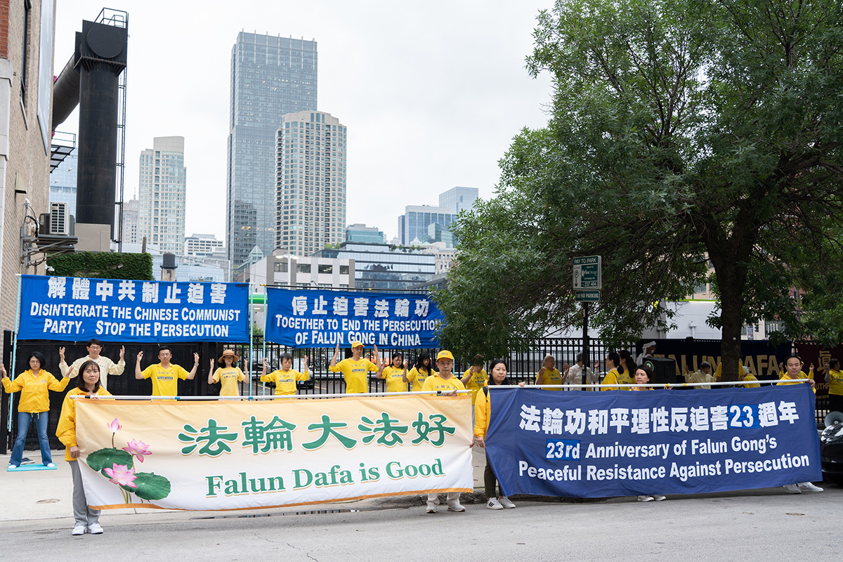 【明慧网二零二二年七月十九日】二零二二年七月十六日周六傍晚,美国大芝加哥地区部分法轮功学员在芝加哥中领馆前集会,揭露和抗议中共23年来对法轮功学员的残酷迫害,并烛光悼念被迫害致死的同修。