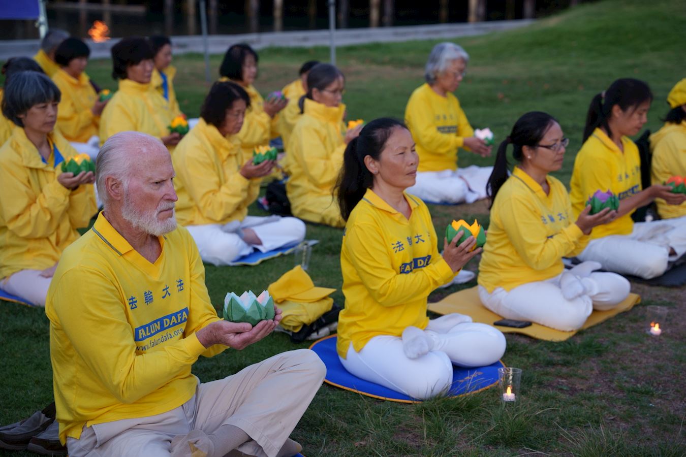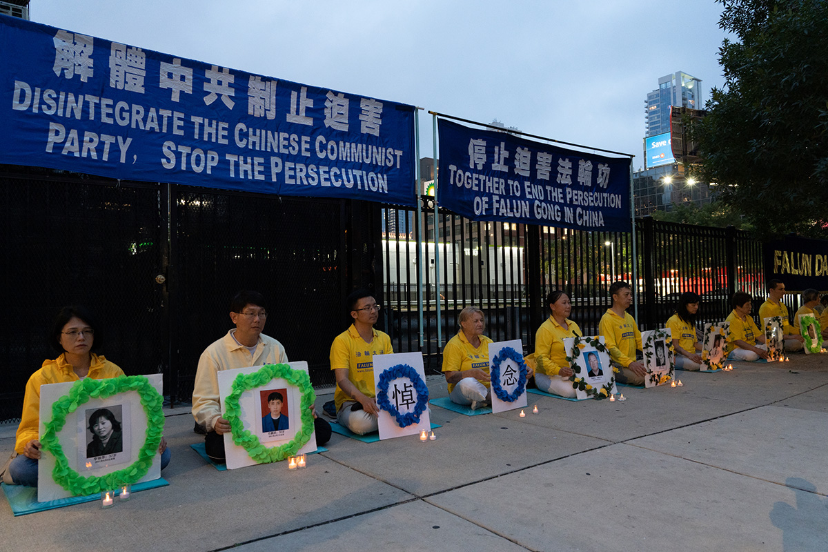 【明慧网二零二二年七月十九日】二零二二年七月十六日傍晚,纽约部分中西族裔的法轮功学员,齐聚在中领馆前举办烛光夜悼活动。夜幕下,“真、善、忍”三字,熠熠生辉。法轮功学员手捧点点烛光,在哈德逊河畔比邻而坐,默默悼念23年来,为了坚守正信而被迫害致死的法轮功学员。路过的民众对迫害深表同情。并有路人感受到强大能量,加入静坐。