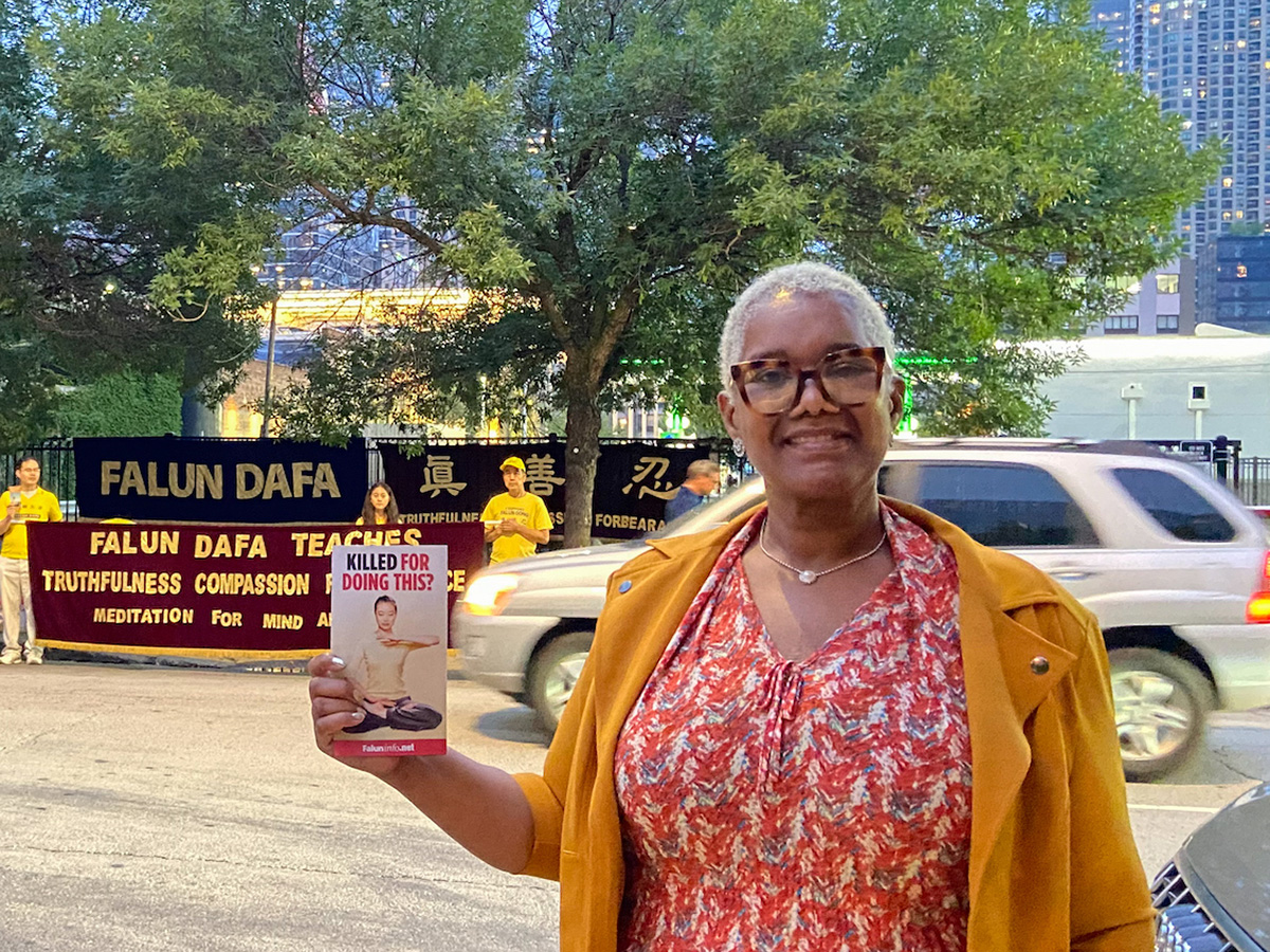 丽塔(Rita)居住在芝加哥市中心,她去年十月从亚利桑那州搬到芝加哥。她表示她平时很少会经过中领馆所在的这条街, “通常情况下,我会走另一条路”,她说,“但是我今天来到了这里,看到了他们(集体炼功),我不相信这只是巧合!”