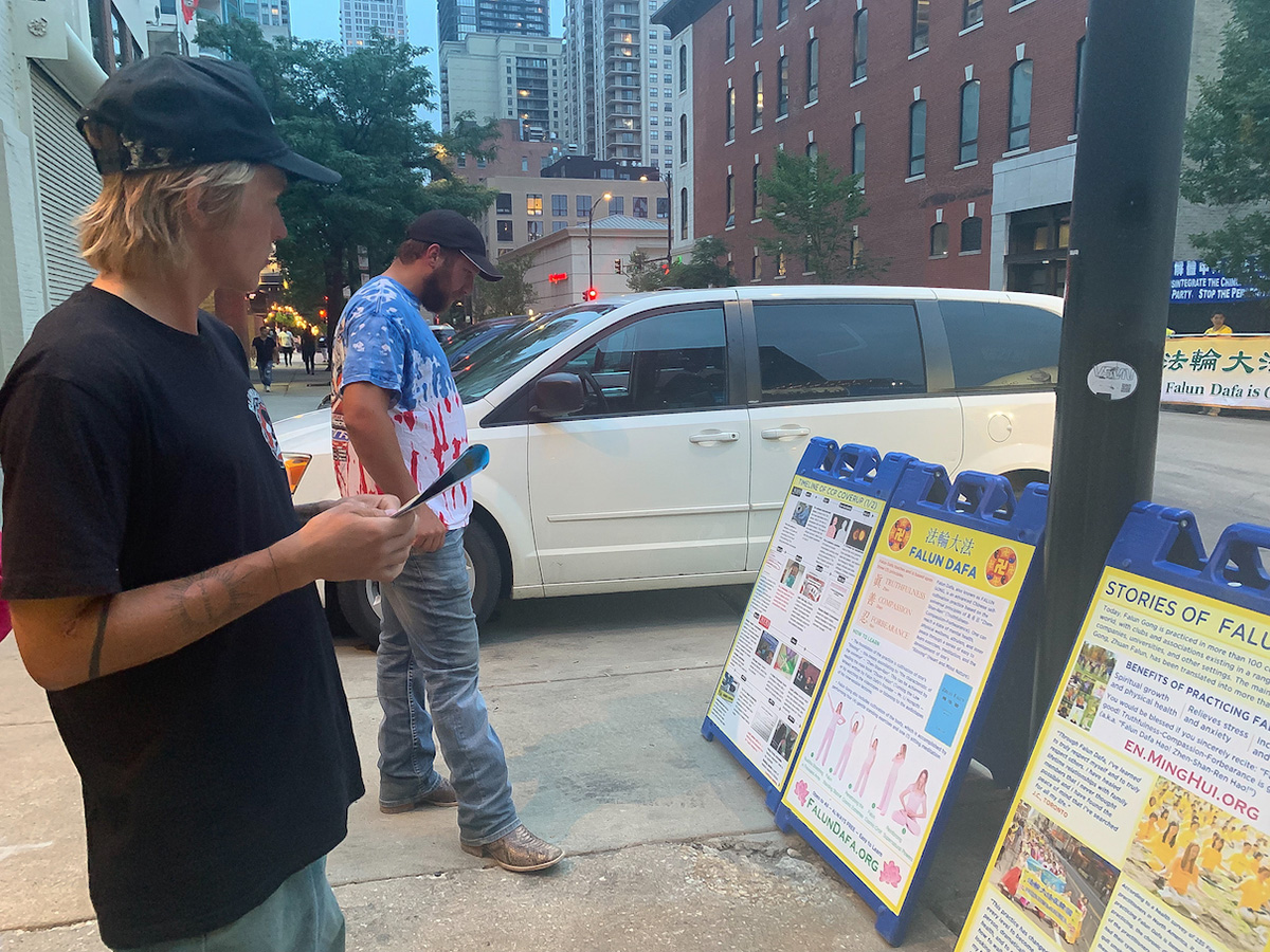 尼克(Nick)和卡登(Kaden)结伴来芝加哥旅行,他们同在印第安纳一家石油管道公司工作。他们表示这是第一次听说中共对法轮功的迫害,更是对中共活摘法轮功学员器官以移植获利的骇人罪恶,感到难以用言语表达的震惊和不安。