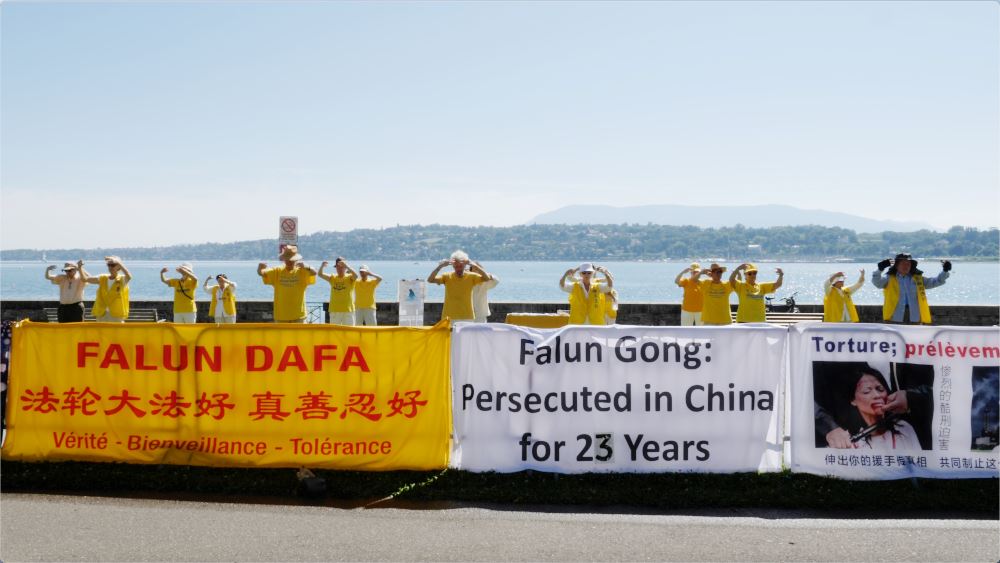 【明慧网二零二二年七月十九日】二零二二年七月十四日,瑞士法语区部份法轮功学员在日内瓦联合国人权事务高级专员办事处对面,举行了和平反迫害23周年活动,呼吁国际社会及瑞士联邦政府和州政府共同制止中共对法轮功学员的迫害。