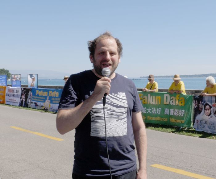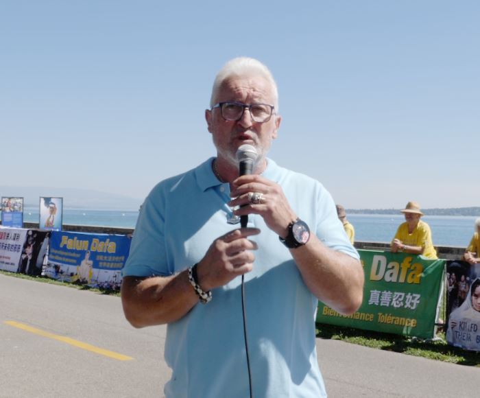 日内瓦州大议会议员艾玛纽埃尔·德奥纳(Emmanuel Deonna)发言说:“人权是普遍的,不可分割、也不能否认的。我们现在在联合国人权事务高级专员办事处面前,在人权之城,国际人权之都,众多国际政府和非政府组织的所在地,我们心里想着所有受迫害的中国朋友,法轮大法修炼者,维吾尔少数民族,还有受到中共政权迫害的西藏自治区。”