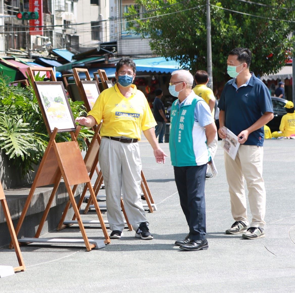 ![]() 图11:图为尼克和卡登阅读法轮功真相展板。 |