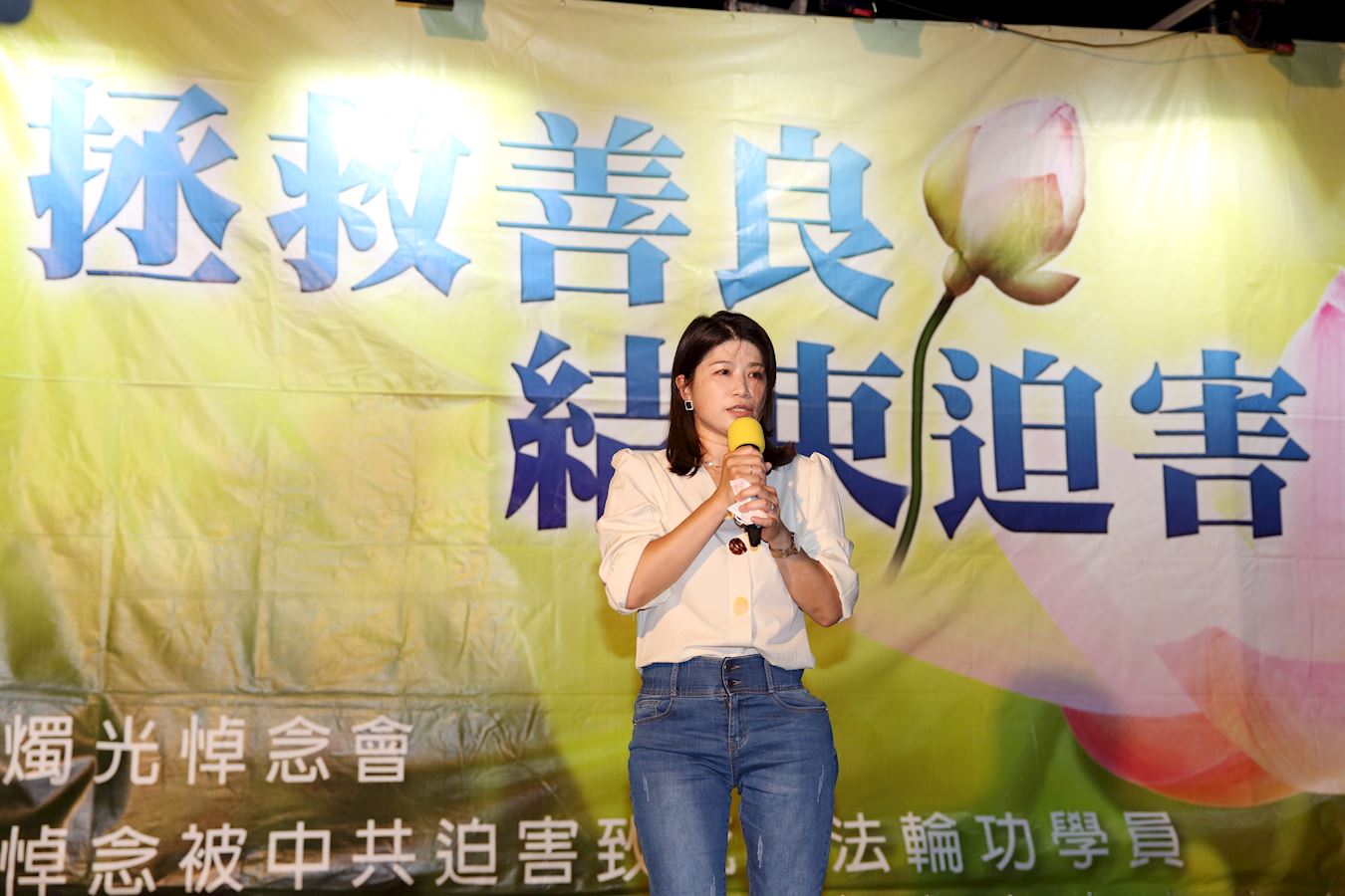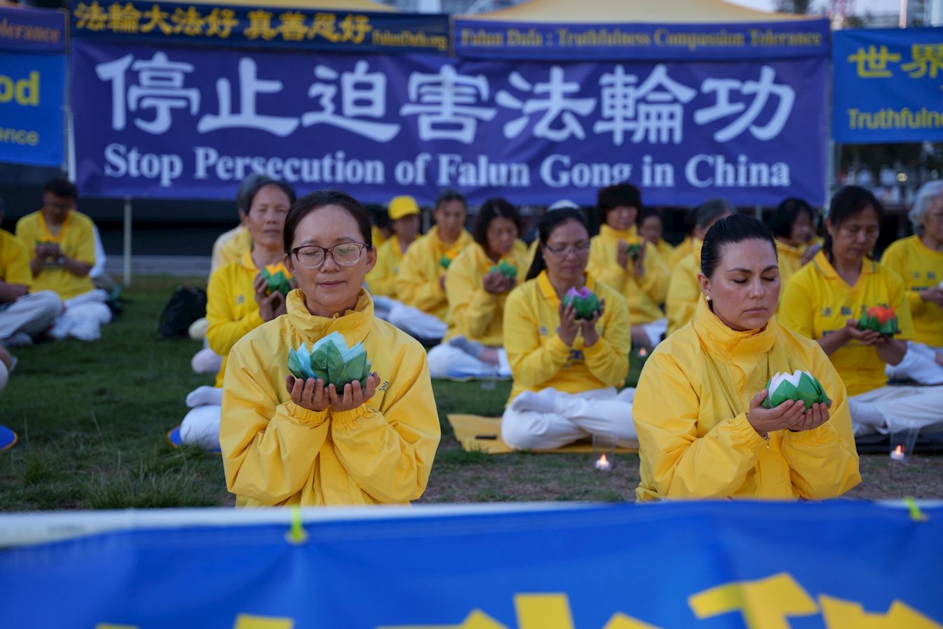 亚里维拉(Isabel Maria Rivera)路经法轮功学员的烛光夜悼。她说:“这个场面非常有力量,义工们告诉我在中国发生的迫害,活摘器官、个人故事,传单上的内容让我们今天知道了之前不知道的信息。我们支持你们!”