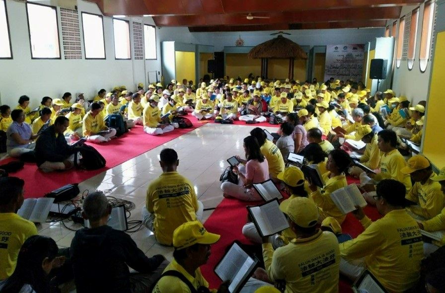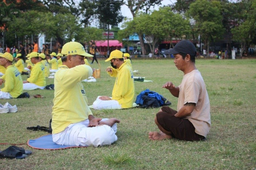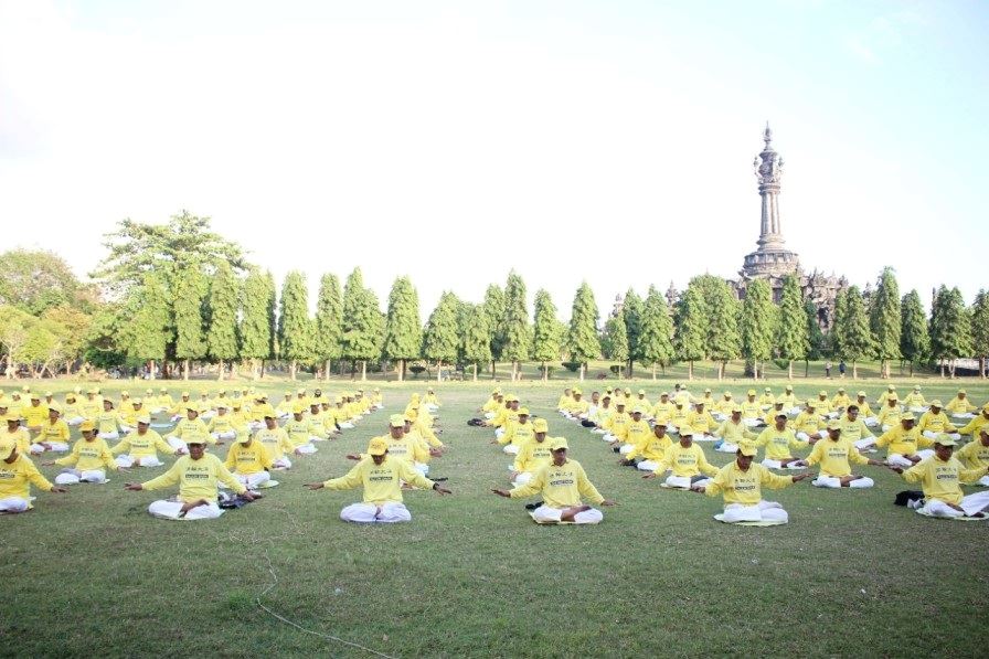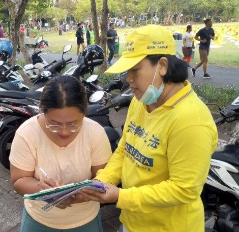 位于登巴刹RENON的尼提曼陀罗(Niti Mandala)广场,清晨时,身穿黄色衬衫的法轮功学员来到这里,优美的音乐伴随着炼功动作,气氛柔雅祥和,部份学员或向行人分发法轮功真相传单,或征集签名支持停止迫害。
