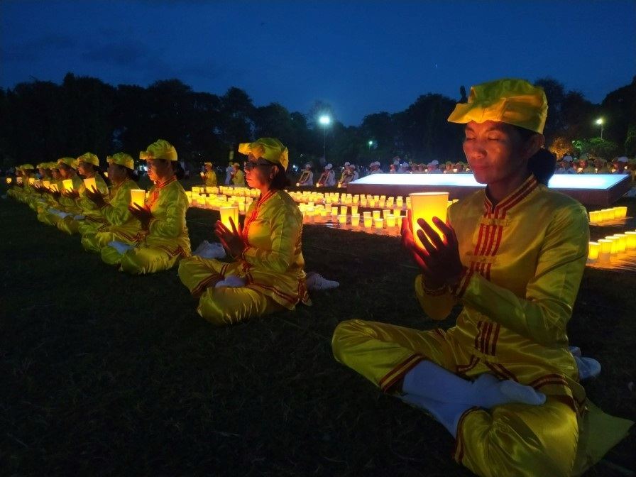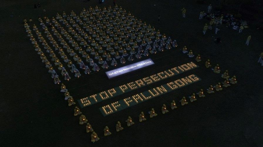 烛光夜之前,由学员组成的腰鼓队出场演奏,向世人传播大法福音。夜幕降临时,一盏盏烛光在广场闪亮,悼念在中国被中共残酷迫害致死的四千八百多名法轮功学员。非常醒目显著的大型照明灯写着“结束长达23年对法轮功的迫害”(End 23 Years Persecution of Falun Gong),向民众传递明确的信息。