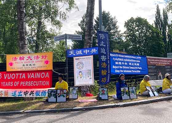 法轮功学员在芬兰首都赫尔辛基的中使馆前和国会大厦前举办活动,抗议中共对法轮功修炼者的疯狂迫害,并呼吁民众了解真相,制止迫害。