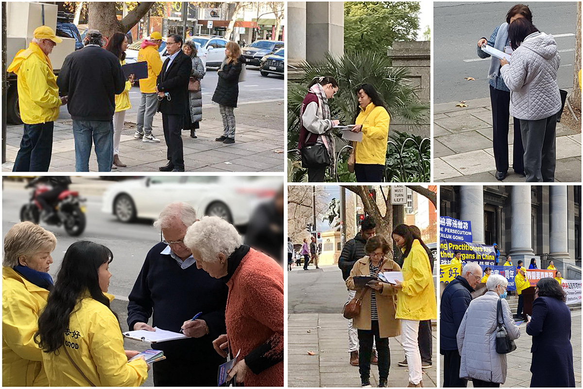 七月二十日傍晚,南澳部分法轮功学员在阿德莱德中领馆前举办烛光悼念,呼吁制止中共对法轮功的迫害。学员们手持有被迫害致死中国法轮功学员照片的花圈,静坐抗议。