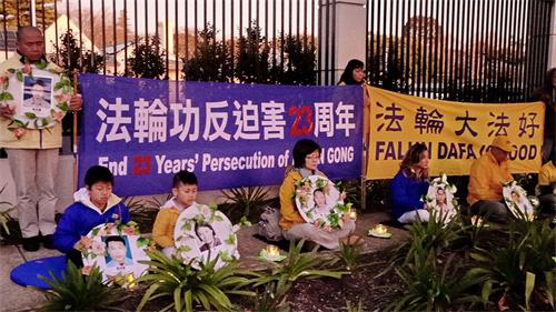 七月二十日傍晚,南澳部分法轮功学员在中领馆前举办了烛光悼念活动。