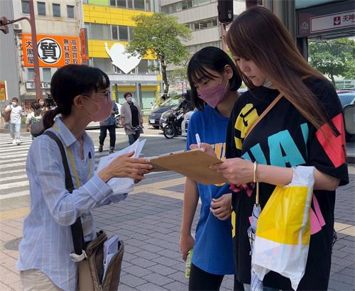 有位来自韩国的大学生听完学员的说明后,用流利的日文说:“我是韩国人,正在福冈的一所大学读书。我没想到中国竟然发生如此严重的人权迫害,太可怕了。我的签名能够成为一份正义的力量的话,我就愿意签。”