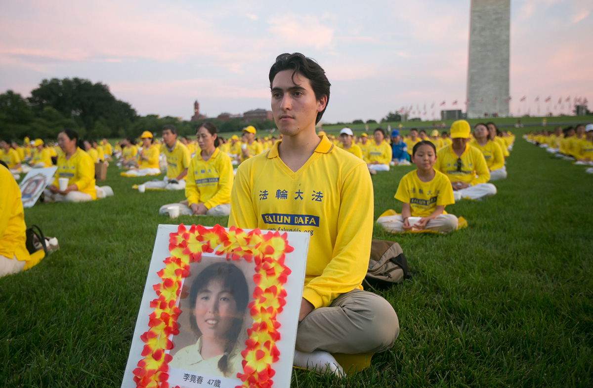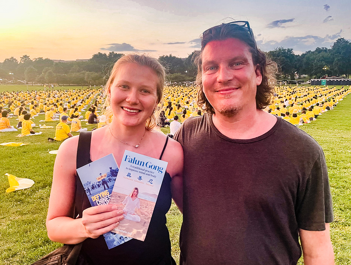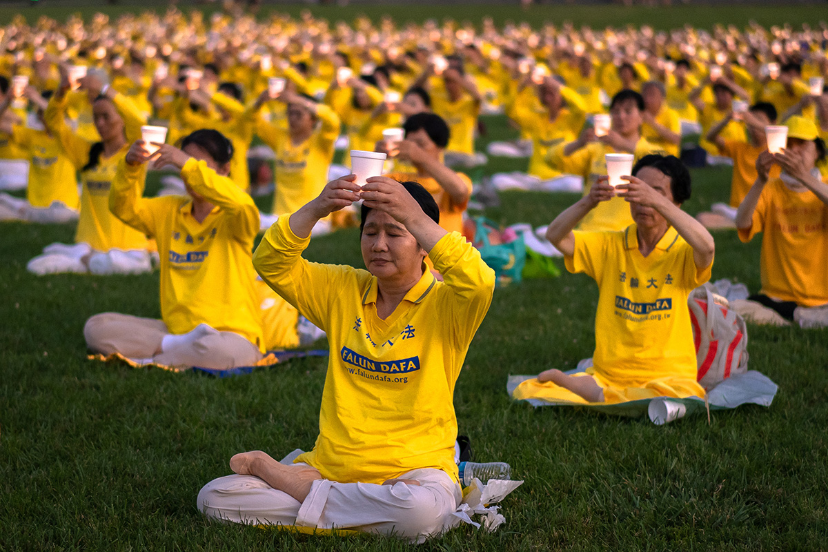 伴随夜幕降临,一千多名法轮功学员身着黄色上衣,举起手中烛光,静静坐在白宫对面的草坪上。一位游客说,她感到现场有“强大而平和”的能量。驻足拍照的游客中,许多人是第一次听说法轮功被迫害的情况,他们都对真、善、忍表示赞同,认为具有普世价值。