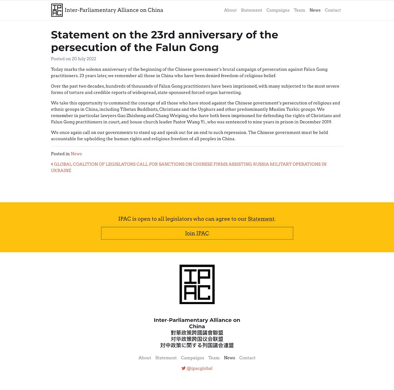 IPAC在七月二十日的声明中表示:“今天是中国政府(中共)开始对法轮功学员进行残酷迫害的沉痛纪念日。 二十三年后的今天,我们惦念着所有在中国被剥夺宗教信仰自由的人们。 ”
