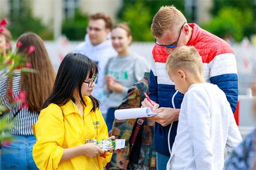 活动当天正好在杜赛尔多夫有一个大型游乐场节日(Kirmes in düsseldorf),市中心聚集了很多来自不同国家的游客。他们中不少人是第一次听说法轮功和中共的迫害。了解到法轮功真、善、忍的准则后,很多人都表示无法理解为什么一个政府要迫害这样的修炼人,并纷纷为反迫害签名。杜塞尔多夫的许多当地人都曾看到过学员的信息点,一些人直接问学员哪里可以签名,并表示已经知道真相。一位年纪比较大的华侨看到学员就立刻说:“我知道这是你们的反迫害二十三周年。”
