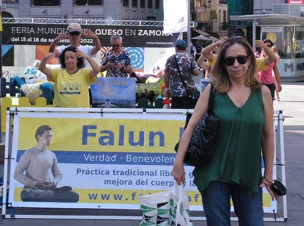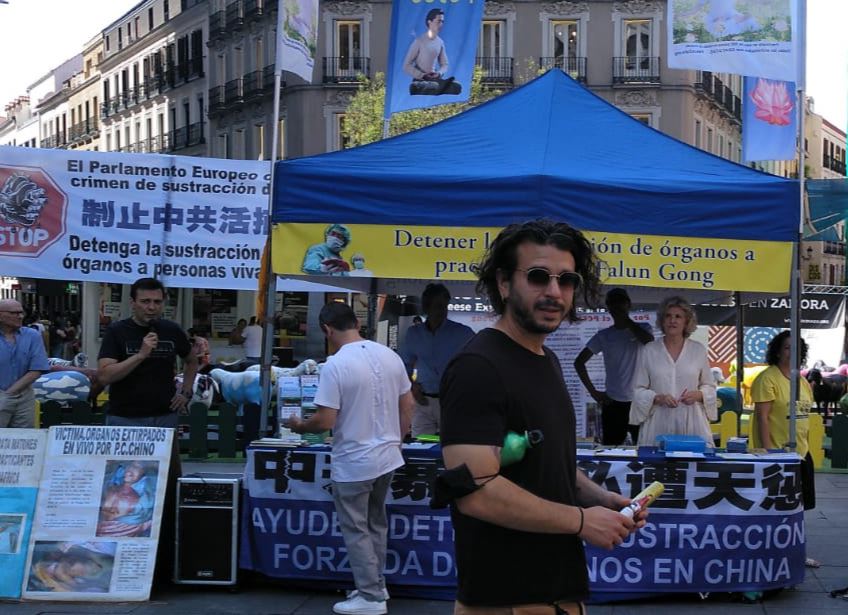 七月十六日上午,马德里烈日炎炎,法轮功学员在市中心卡亚俄广场摆放了法轮功弘传世界、及揭露中共酷刑迫害的真相展板,吸引了很多路人观看、并纷纷签字支持学员反迫害,谴责中共暴行。