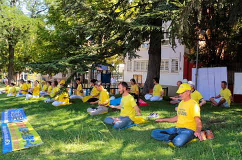 ![]() 图6~9:西班牙法轮功学员中使馆前举办反迫害23年集会。图中学员在演示法轮功功法。 |