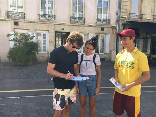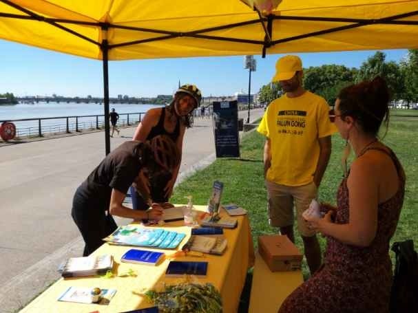 七月二十四日,在波尔多市(Bordeaux)加隆(La Garonne)河畔夏尔彤(le Quai des Chartrons)地段,法轮功学员进行了炼功和讲真相活动,同时向民众征集签名,反对中共对法轮功的迫害。
