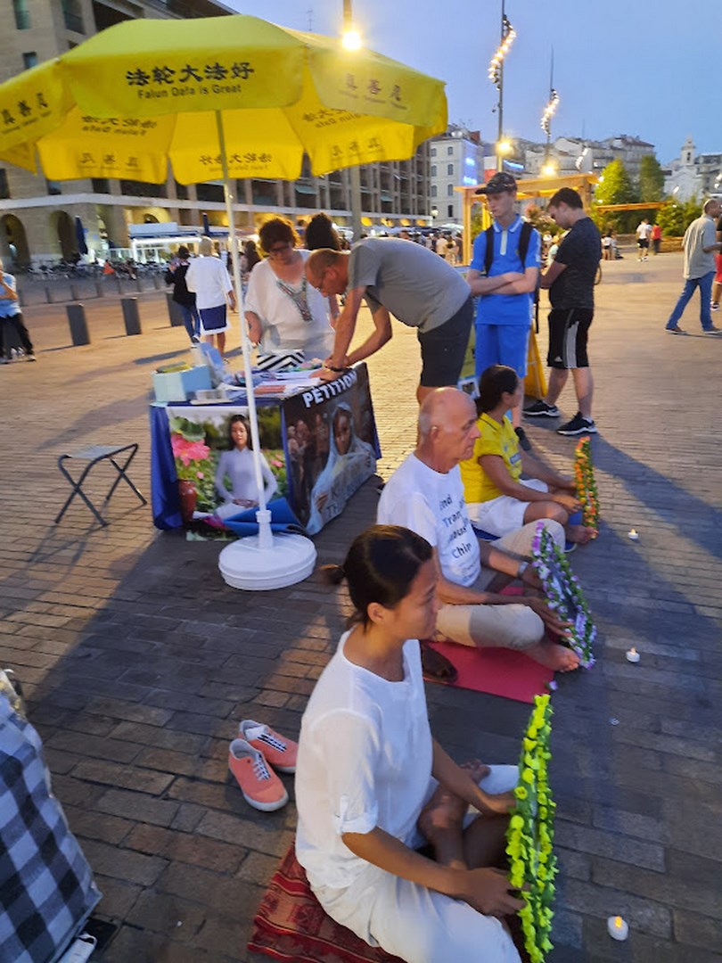 七月二十日傍晚,在马赛的老港(Vieux-Port)、马赛市政府对面,法轮功学员举办了烛光悼念活动,悼念被中共迫害失去生命的法轮功学员,同时,警醒人们和政府官员,中共对中国民众的迫害罪行。