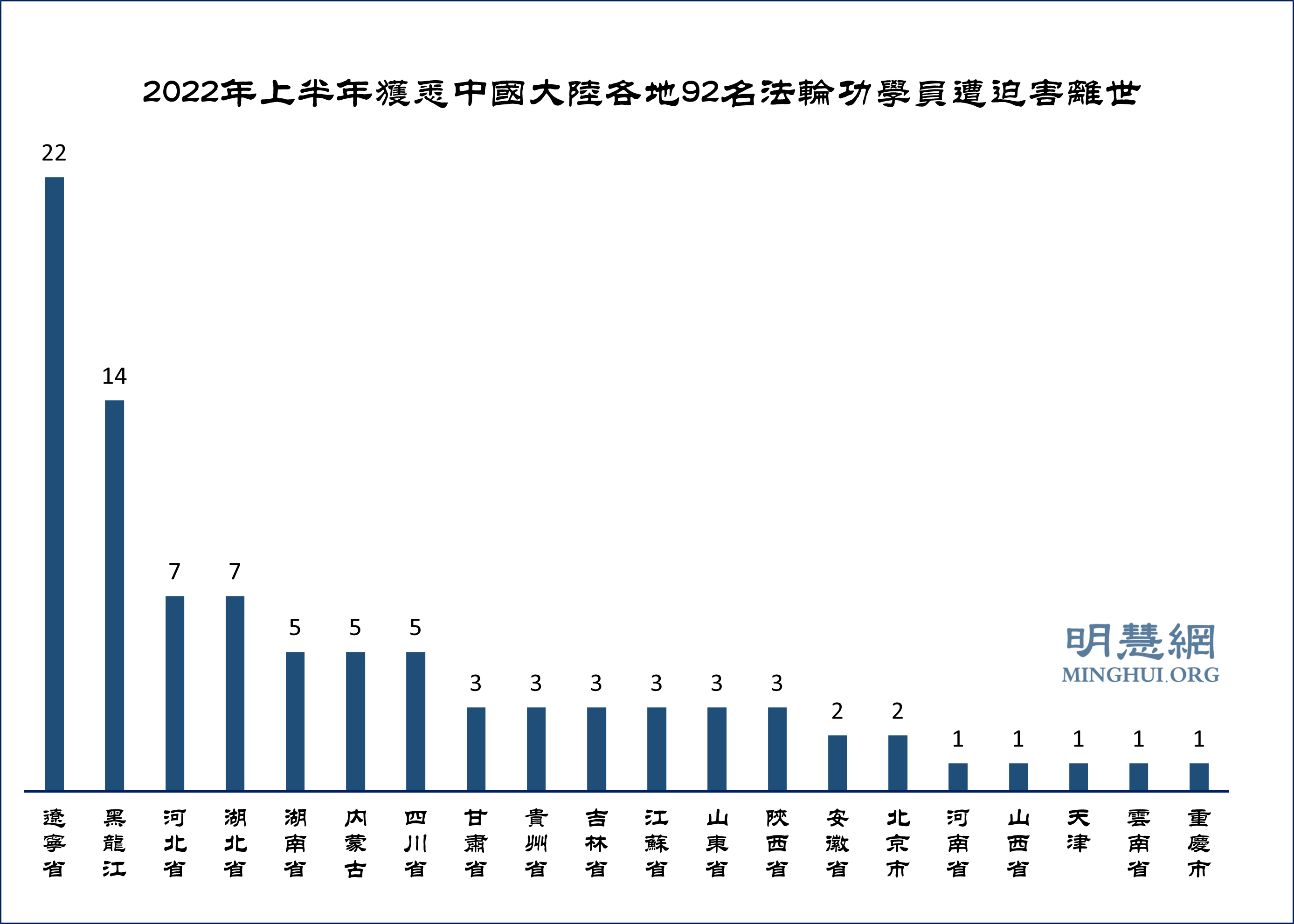 据明慧网报道统计,二零二二年一至六月份获知,又有92名法轮功学员被中共迫害离世,其中,男性法轮功学员37名,女性法轮功学员55名,年龄最长者八十九岁,最年轻者四十四岁。他们中有各种职业,如国家公务员、副教授、警察、财务总管、工程师、教师、中国网通集团职员等。