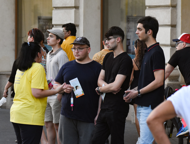 有两位年轻人正在佛罗伦萨音乐学院进修。他们被悠扬的音乐所吸引,走过来拿取传单和莲花。后来,他们又回来给同去的人拿了两朵莲花,看着展示板,开始询问为什么在中国会发生迫害。他们无法理解当今世上还有如此残忍的迫害存在,但他们确信,那些能够对没有做错事的人做出如此可怕的行为的人,是被邪恶的政权—— 中共利用了。