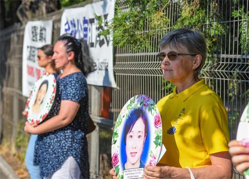 二零二二年七月二十日,法轮功学员在中共大使馆举行和平抗议,他们举着写有“真善忍”和“停止迫害法轮功”的横幅,手持被中共迫害致死的法轮功学员的遗照。他们要求停止迫害,并将迫害元凶绳之以法。