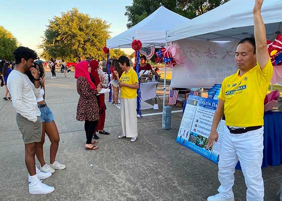 七月四日晚,德克萨斯达拉斯地区的法轮功学员参加了布兰诺市观看焰火活动,向人们介绍法轮大法,传真相、送福音。