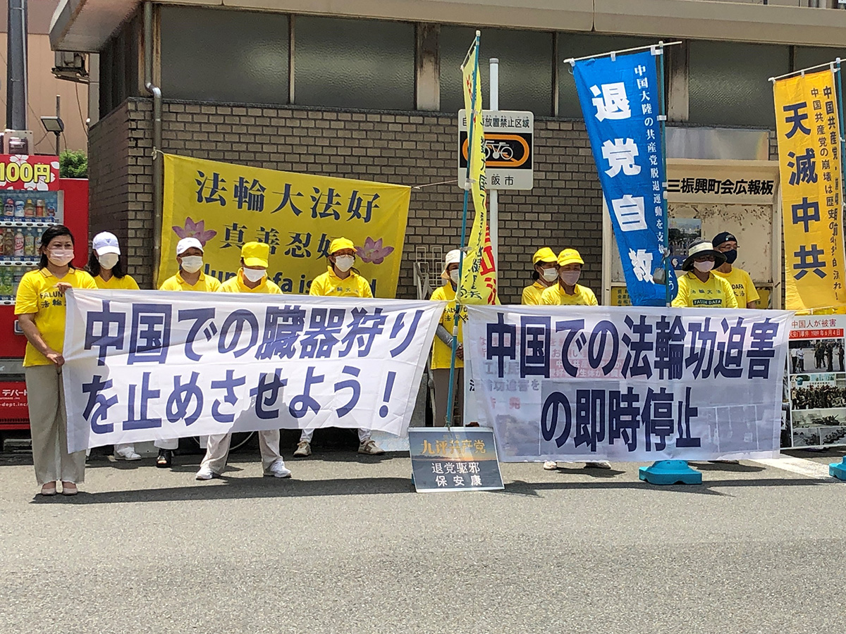 每年七月二十日,海外的法轮功学员除了举行大型的游行集会、烛光悼念等活动之外,也都会在中国(中共)驻海外领事馆、大使馆前和平抗议,日本关西地区也不例外,广泛的向大众传递法轮功真相并揭露大陆法轮功学员被迫害的现状,希望能够唤醒更多的人认清中共。