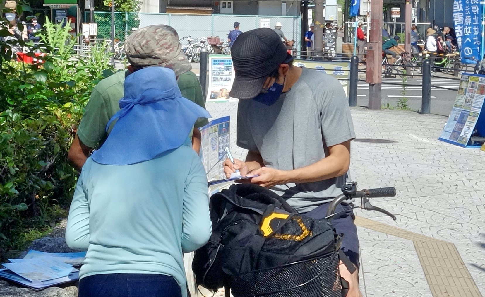 有位日本民众早在十多年前就听说过法轮功受迫害的事实,以为迫害早就停止了,今天在此看到真相展板和横幅,才知道迫害仍在继续,就自己主动要求签名,并表示会将此事告诉朋友,也让他们来签名。临走前,还向法轮功学员多次鞠躬表示敬意。
