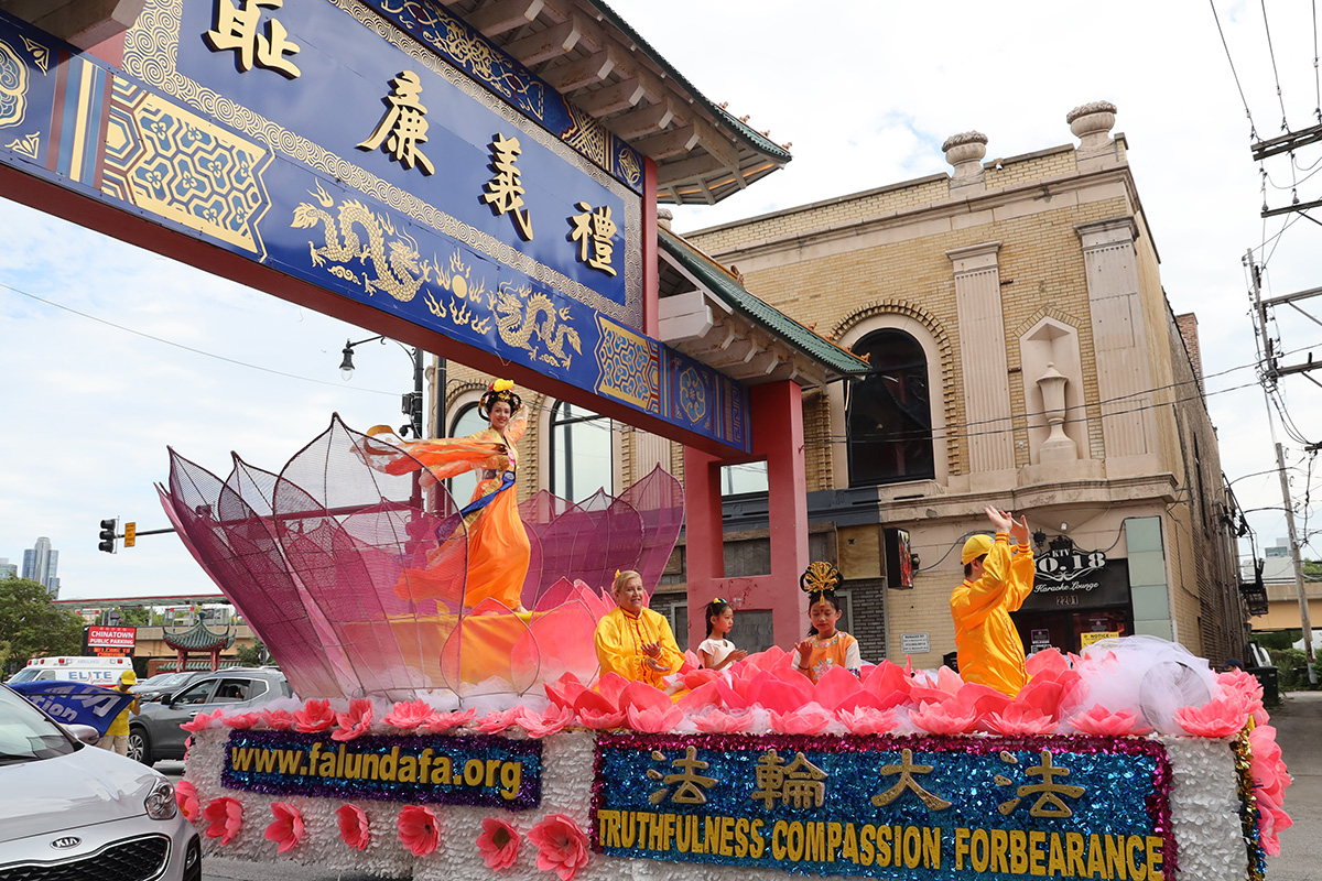 法轮功学员在中国城的大游行包括身着蓝色唐服的旌旗方阵、唐鼓阵、炼功方阵、展示功法的花车、身着白衣的致敬被中共迫害致死的法轮功学员的悼念方阵、停止迫害法轮功为主题的方阵,以及庆祝四亿中国人脱离中共邪党的三退方阵。游行吸引了路旁中西方民众,获得不同族裔人们的赞许。