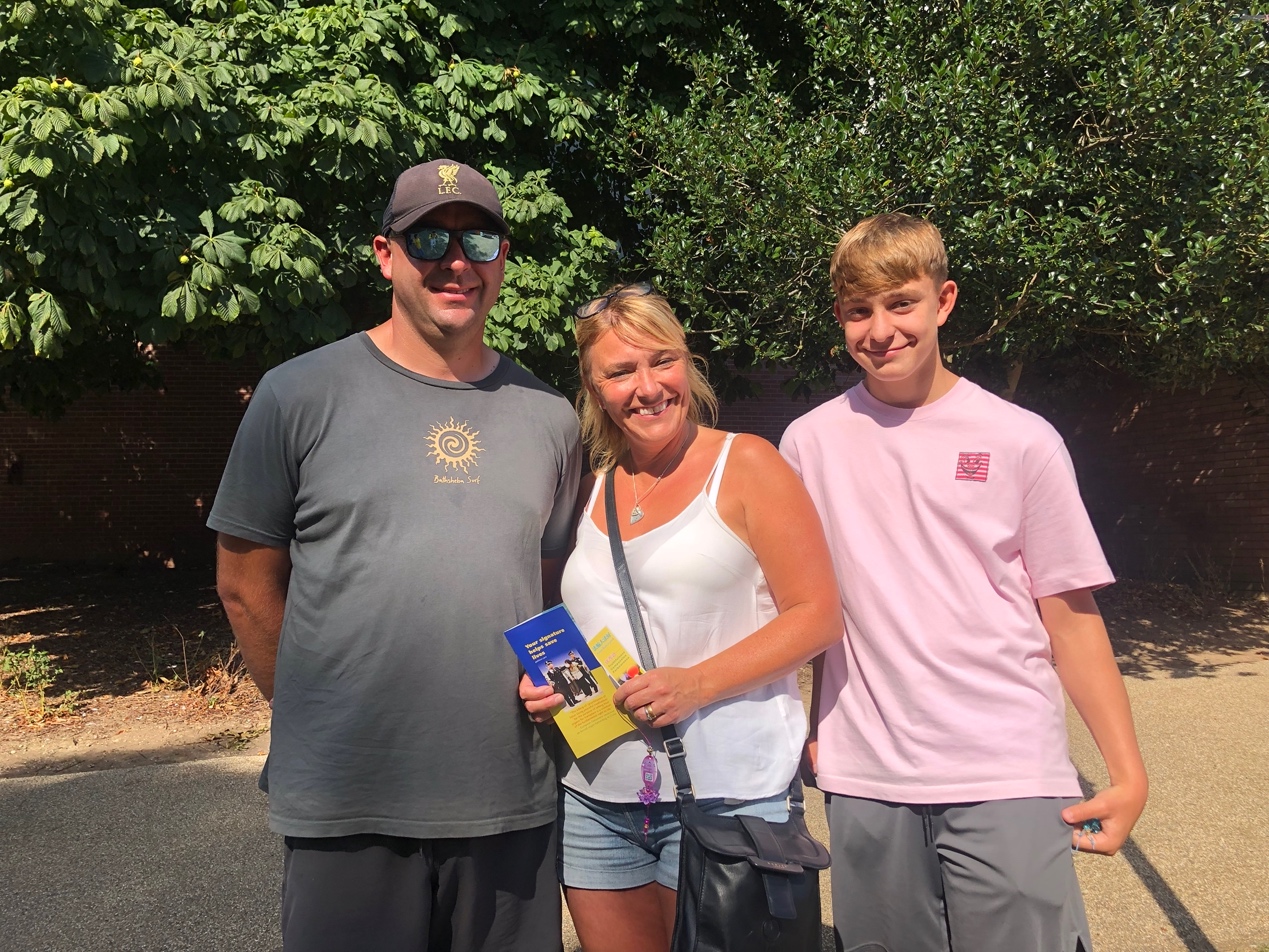 一对夫妇和他们的儿子也被腰鼓队吸引,表示腰鼓队的表演很打动他们的内心。当得知法轮功在中国是被禁止的时候,他们感到不可思议。这位女士还问道,为什么这么好的功法在中国是被禁止的。学员告诉他们真相后,他们感到震惊并合影留念支持法轮功。