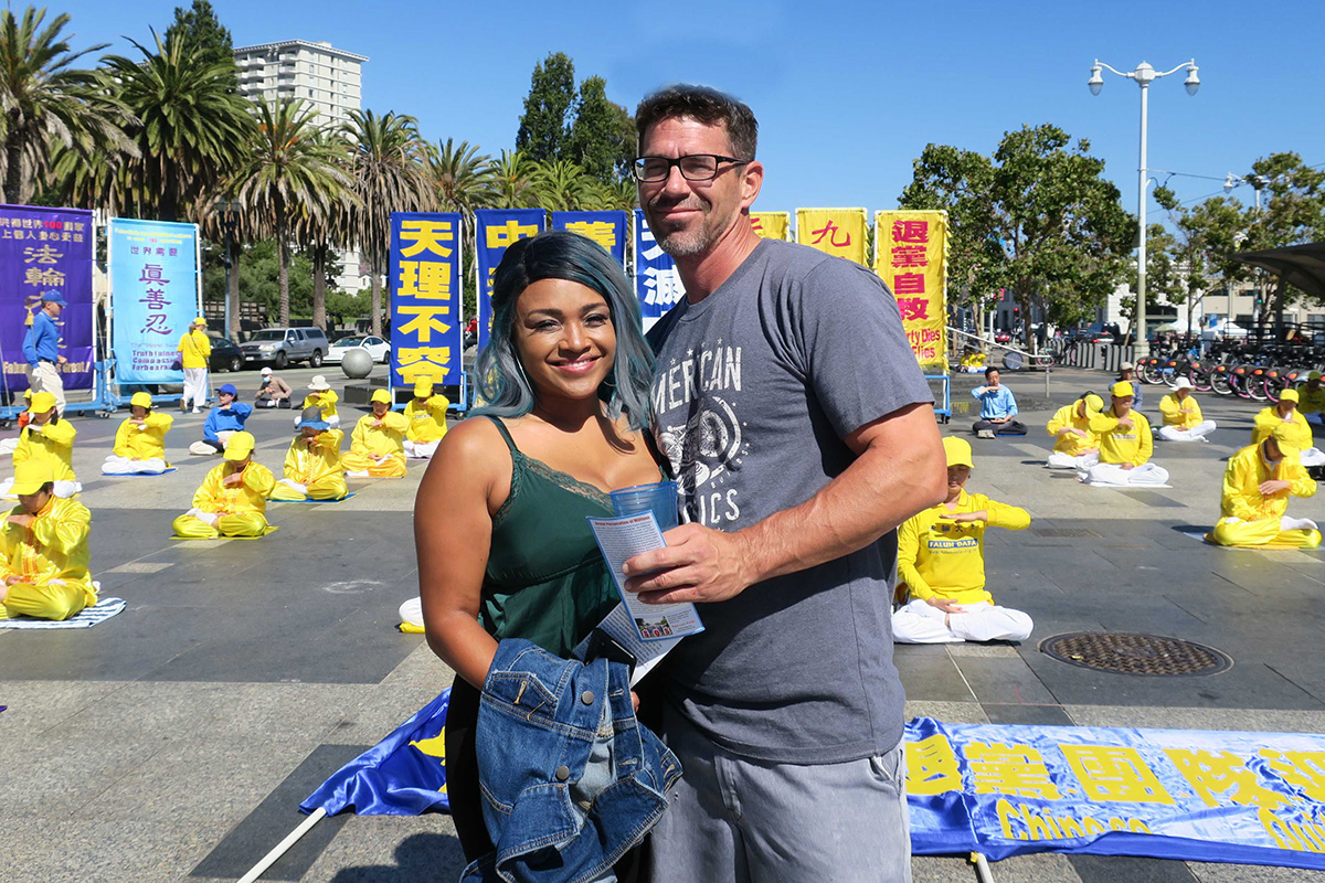 切里·惠特克(Cheri Whitaker)和朋友迈克尔·赛贝尔(Michael Seibel)是沙加缅度居民,当他们在对街看到法轮功学员在炼功,被深深地吸引,特地过来了解情况。惠特克表示,“他们炼功的动作和音乐是如此的美好,深深地吸引着我们,很高兴今天有这个机会看到他们展示功法和听到祥和的音乐,让我感到生命充满希望和美好,我会上网了解什么是法轮功。”