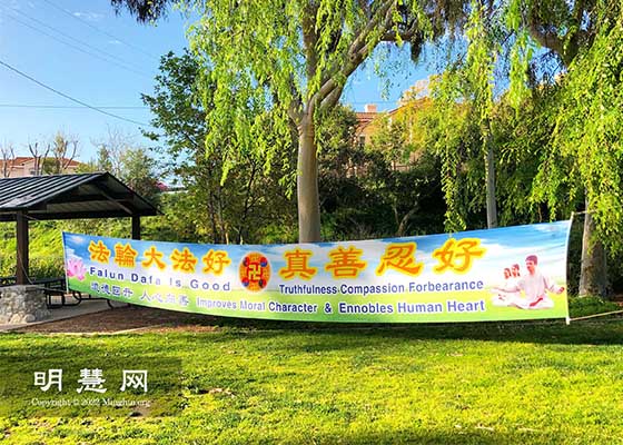 法轮功学员参加了加州博览会,在入口处设立了摊位,向人们介绍法轮功及其真相,不少人驻足了解。