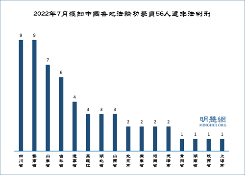 据明慧网七月份报道数据统计,今年七月份获知又有55名法轮功学员被非法判刑。非法判刑分布于16个省、自治区、直辖市。非法判刑迫害最严重地区是云南省9人,四川省8人,山东省7人,吉林省6人。