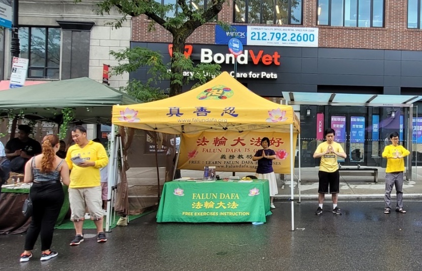 从早上十点到下午六点,虽然是盛夏酷日当头,法轮功展位前的功法展示一直没停。烈日下,法轮功学员们向人们介绍法轮功,并且征集签名制止迫害。舒缓整齐的功法展示立即吸引纽约街市上人们的关注。很多人接受介绍大法传单,还有一些人当场学功。
