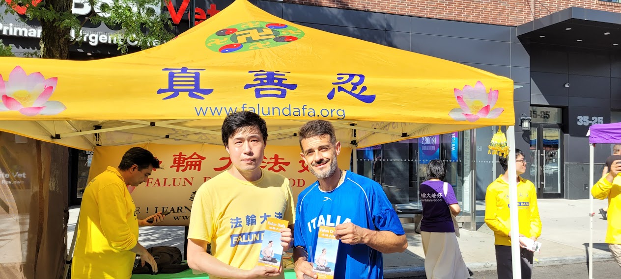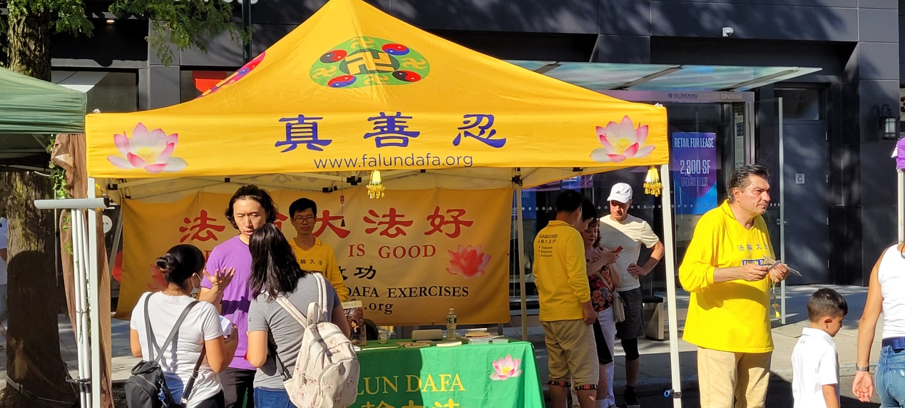 【明慧网二零二二年八月九日】二零二二年八月七日星期日,在法轮功反迫害23周年之际,纽约市法轮功学员在阿斯托利亚节(Astoria Festival)街头集市上,展示法轮大法功法,向民众介绍法轮功,并且派发法轮功传单和小莲花。
