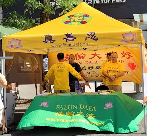 图1:阿斯托利亚节(Astoria Festival) 街头集市上,展示法轮大法功法