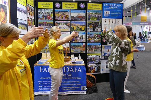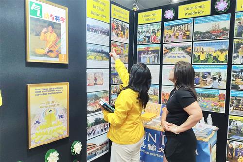 博览会上有一百八十七个不同的团体参展,为期三天的活动吸引了上万民众参与。法轮功学员向过往的民众介绍了法轮大法的美好以及被中共迫害的真相。有些民众在法轮功展位前学炼法轮功五套功法,很多民众向法轮功学员征询了当地炼功点地址,希望以后一起修炼法轮功。