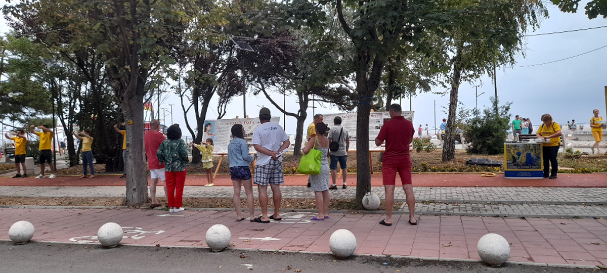 二零二二年八月十五日,法轮功学员来到南伊芙利亚(Eforie Sud)海边设立真相点,传播法轮功的真相。游客驻足观看。