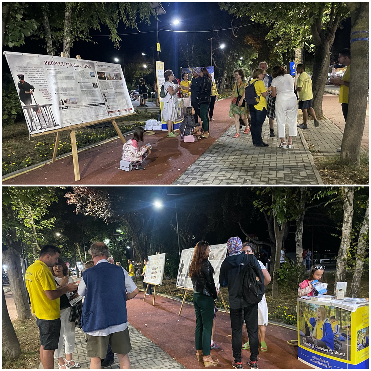 图5~6:夜幕降临,南伊芙利亚海滩的游人依然不断,游人们经过真相点时,有的阅读真相展板;有的与学员交谈,了解法轮大法的信息。