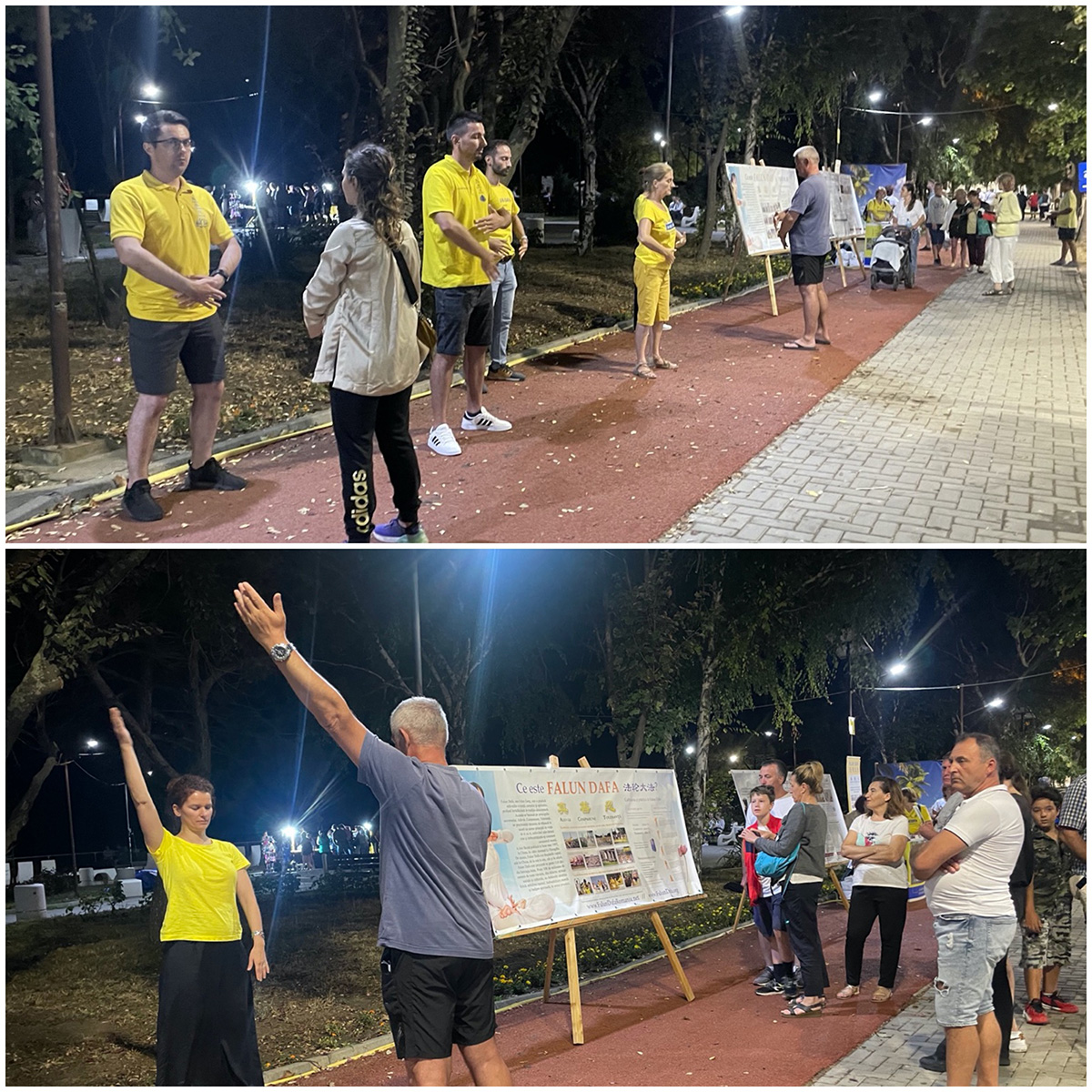 图9:二零二二年八月十三日,法轮功学员在玛玛亚(Mamaia)海滨度假区举办弘法讲真相活动。有的游人驻足观看学员演示功法,有的现场学功。